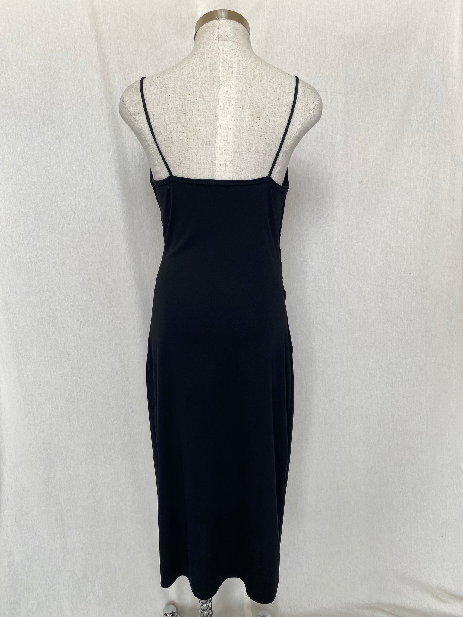 Measurements laying flat: 39cm underarm, 34cm waist, 45cm hip, 115cm shortest length - fairly stretchy